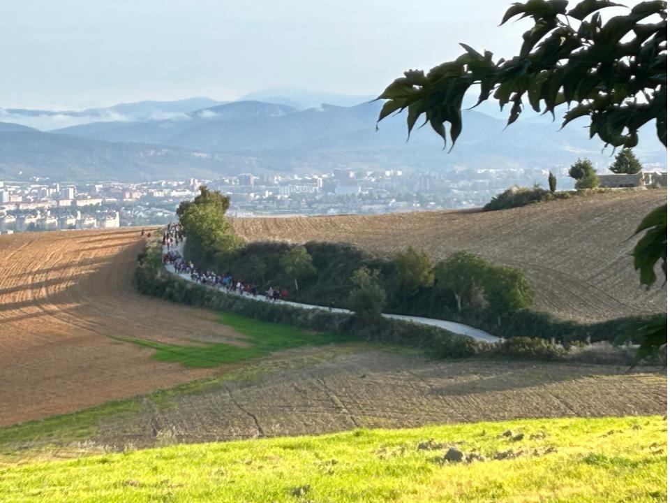 El alumnado de 1º de ESO realizó una caminata hasta el monte Perdón, siguiendo la ruta que sigue el Camino de Santiago. Durante el recorrido hicieron pequeñas paradas, como en el pueblo de Zariquiegui.